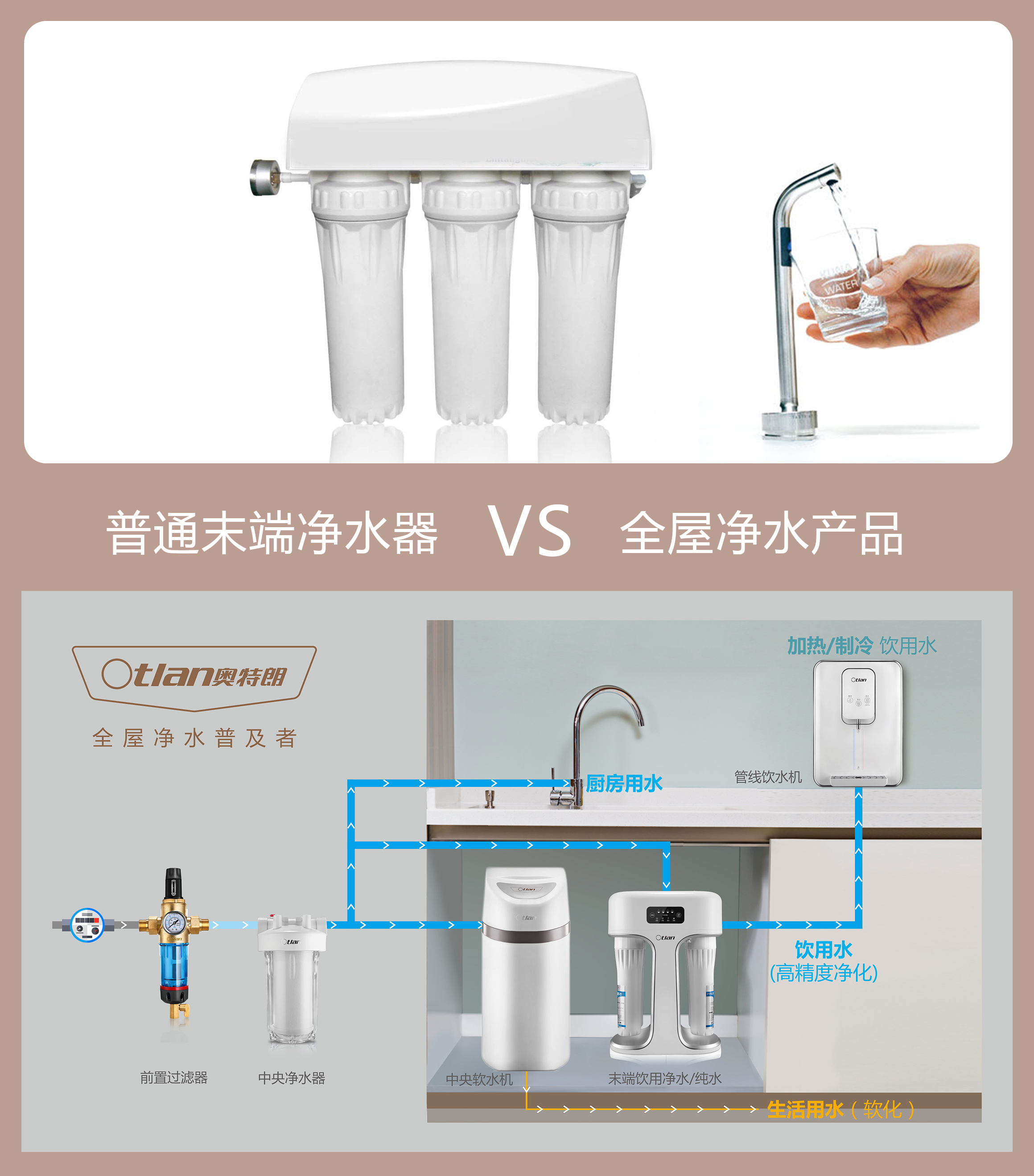 世界卫生组织(WHO)相关研究表明,“水中有害物质”被人体吸收的主要途径和大致比例是:1/2经口腔摄入(饮水、餐食、漱口刷牙),1/2由皮肤吸收和呼吸道吸入(洗手、洗脸、沐浴)。 由此可见,饮用水只占生活用水不到10%,仅仅净化饮用水是完全不够的,自来水中的污染物还可能通过食物、皮肤进入我们的身体,影响我们的健康。而全屋净水不仅能够净化饮用水,还能去除厨房和洗浴用水中的污染物。 1、过滤水中铁锈、泥沙、寄生虫等 自来水从水厂到用户家的这段过程,会经过漫长的管网输送,其中小区通过水箱进行二次加压供水,存在着最为普遍的二次污染问题,水箱由于疏于管理往往成了虫鸟鼠等小动物的栖息地、藏污纳垢的重灾区,滋生铁锈、泥沙、水藻、寄生虫等污染物,如果不加以净化,会直接污染饮用水、厨房和洗浴用水! 而全屋净水系统中的前置过滤器可以有效滤除这些大颗粒物质,从水源入户开始改善水质。 2、净化水中余氯等有害化学物质 水中余氯也就是我们常说的漂白粉残留,漂白粉等氯化物是自来水厂和小区物业对自来水杀菌消毒的必用也是常用化学添加物,如果添加不当就会造成水中余氯超标,余氯是国际公认的致癌物,遇热还会和水中有机物反应生成毒性更强的致癌物,而厨房和洗浴用水都不免要加热,加之余氯极易被人体皮肤、口腔黏膜、呼吸道还有食物吸收,所以说余氯是自来水当中最常见、也是危害最严重的污染物,也是全屋净水系统里中央净水器的首要净化目标。 3、软化水质,去除水垢,美容护肤 中国水质普遍偏硬(自来水中钙镁离子含量偏高),硬水会导致很多问题,例如:水垢严重、有碍皮肤清洁和吸收水分、洗衣令衣物发黄僵硬等。而全屋净水产品中的软水机通过离子交换技术,可以有效去除自来水中的钙镁离子,降低硬度,软化水质,系统技术。软水又称美容水,使用软水洗脸、沐浴、洗头,不仅滋润肌肤,头发也更柔顺,是爱美人士的不二之选。 奥特朗,全屋净水普及者。其最有特色、也是全屋净水最为核心的新一代产品——奥特朗全屋中央净水器,引进GE净化技术、原装进口滤芯,过滤精度高,净化效果好,一机多能,饮用水、厨房和洗浴用水全面净化。更让消费者心动的是:比传统中央净水机体积小的多,价格也更亲民,能极大提高中国家庭的生活品质!