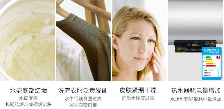 硬水给我们的身体和生活带来了好多麻烦。比如加速皮肤老化、头发难以梳理,衣物褪色干结,缩短热水器使用寿命,堵塞龙头内部的精细管路,影响使用效果。