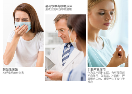 余氯对人体有很大的危害:它会刺激眼睛,鼻子,喉咙以上呼吸道等,引起急性肺水肿,麻痹呼吸神经中区。余氯很容易被人体的皮肤吸收,会让您的肌肤漂白化,皮肤层脱落、产生瘙痒过敏症,致癌几率增加了30%。我们日常饮用咖啡、茶、汤中含余氯的水,受热后产生三氯甲烷等致癌物质将增加3-4倍。